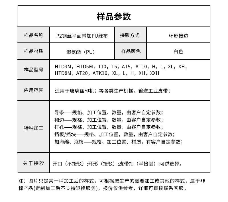 備注:PU同步帶加綠布圖片只是某一種加工后的樣式,可根據(jù)您生產(chǎn)的需要加工成其他的樣式,屬于非標(biāo)產(chǎn)品(定制加工后不支持退換服務(wù)),報(bào)價(jià)僅供參考,詳細(xì)可直接聯(lián)系客服。