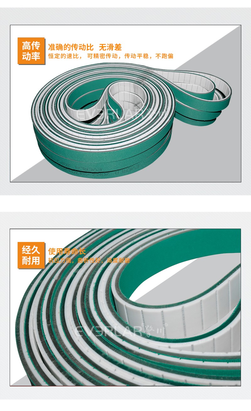 PU同步帶也被稱為聚氨酯同步帶,它是經(jīng)過處理的高強(qiáng)度人工合成聚氨酯作為骨架,涂覆層由聚氨酯樹脂制成。不但具有普通輸送帶的抗拉強(qiáng)度高、曲繞性好、輕、薄、韌等特點(diǎn),而且耐油,耐磨。