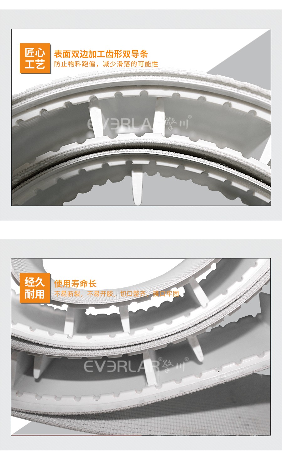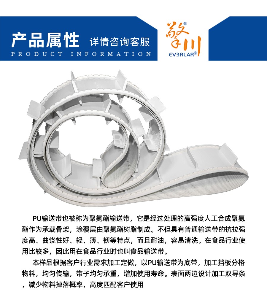 本樣品根據客戶行業需求加工定做,以PU輸送帶為底帶,加工擋板分格物料,均勻傳輸,帶子均勻承重,增加使用壽命。表面兩邊設計加工雙導條,減少物料掉落概率,高度匹配客戶使用。