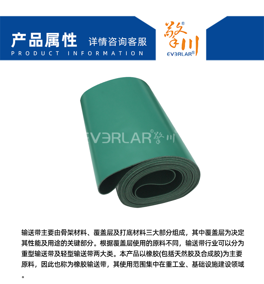 輸送帶主要由骨架材料、覆蓋層及打底材料三大部分組成,其中覆蓋層為決定其性能及用途的關鍵部分。根據覆蓋層使用的原料不同,輸送帶行業可以分為重型輸送帶及輕型輸送帶兩大類。本產品以橡膠(包括天然膠及合成膠)為主要原料,因此也稱為橡膠輸送帶,其使用范圍集中在重I業、基礎設施建設領域。