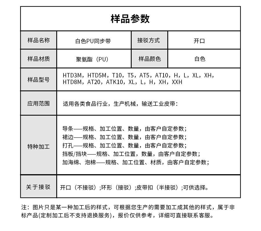 樣品名稱 | 白色PU同步帶 | 接駁方式 | 環形接邊 |
