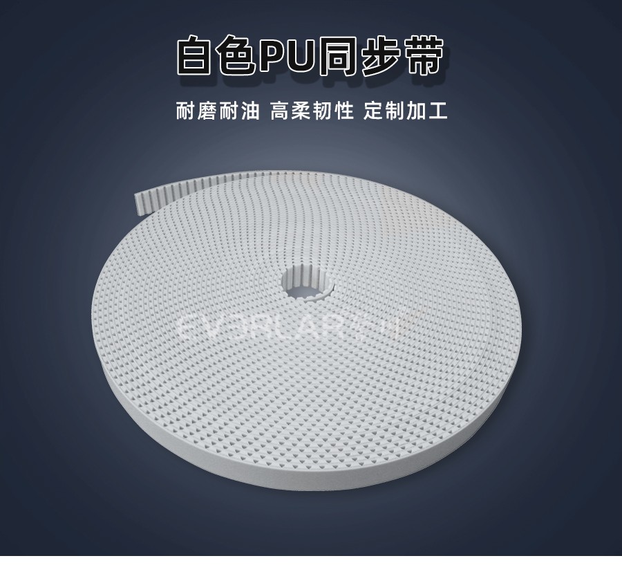PU同步帶也被稱為聚氨酯同步帶,它是經過處理的高強度人工合成聚氨酯作為承載骨架,涂覆層由聚氨酯樹脂制成。不但具有普通輸送帶的抗拉強度高、曲饒性好、輕、薄、韌等特點,而且耐油,耐磨。