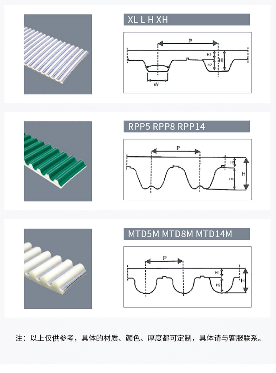 樣品型號 | HTD3M,HTD5M,T10,T5, AT5,AT10, H, L,XL, XH,HTD8M,AT20, ATK10, XL,L,H,XH,XXH | 應用范圍 | 適用各類生產機械 |