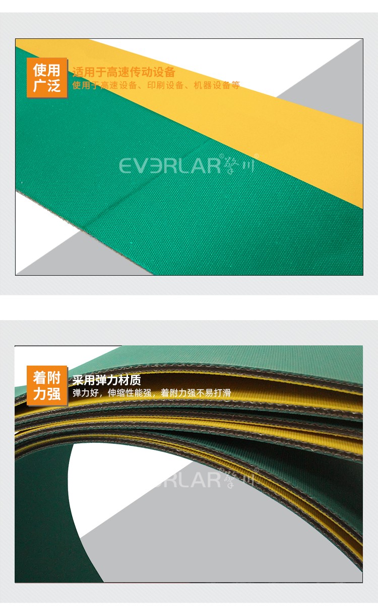 黃綠片基帶具有體質(zhì)量輕、強(qiáng)力高、使用伸長(zhǎng)小、耐油耐磨性好、帶體柔軟、節(jié)能等特點(diǎn):輕型輸送帶具有薄、軟、彈性好、伸長(zhǎng)小、工作穩(wěn)定、使用壽命長(zhǎng)等特點(diǎn)。