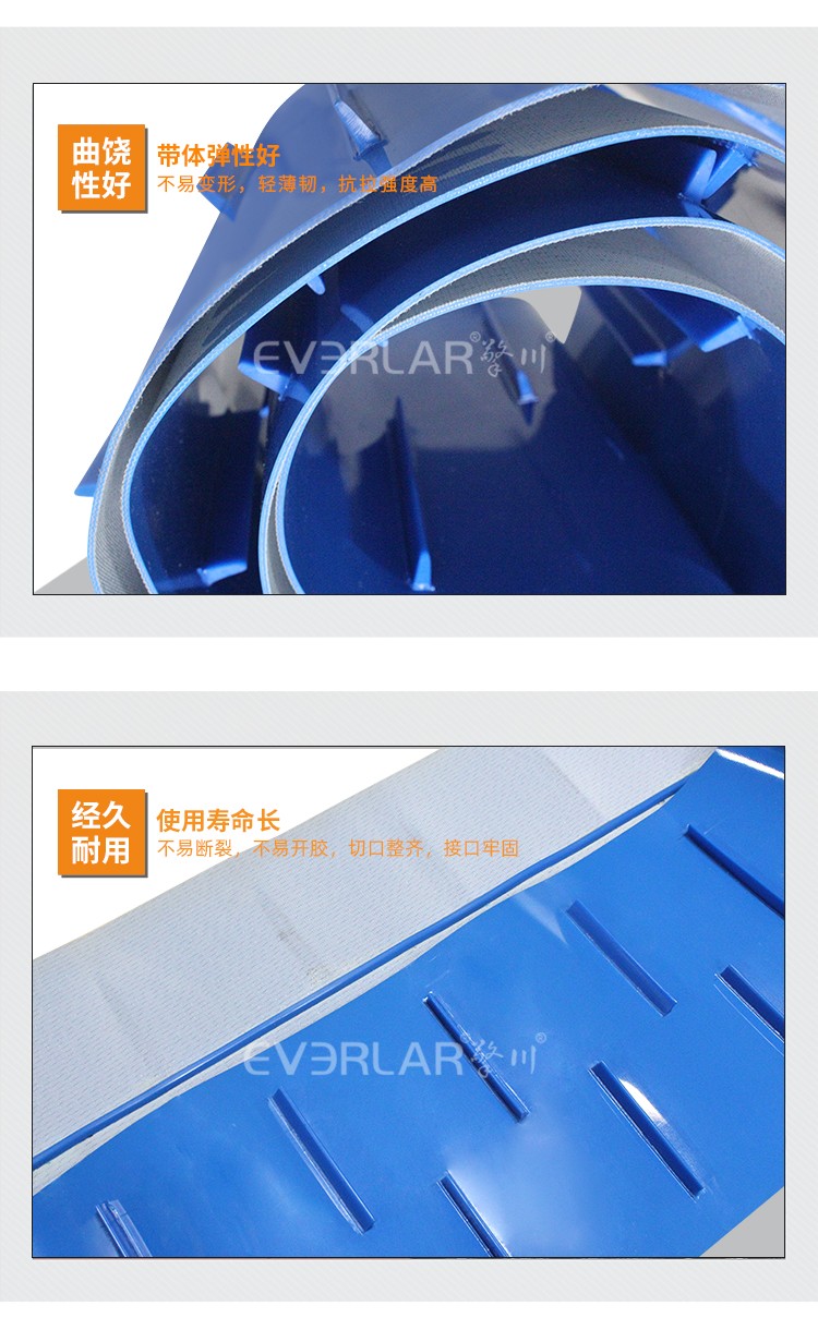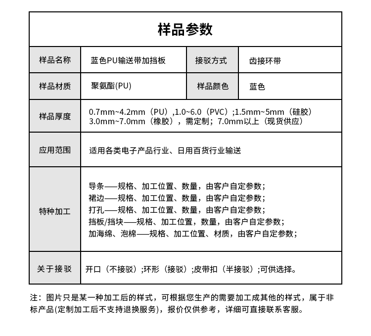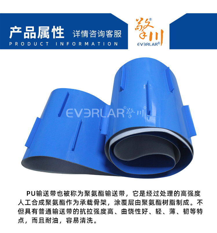 • 產品名稱:藍色PU輸送帶加擋板耐磨耐油耐腐蝕工業皮帶定制