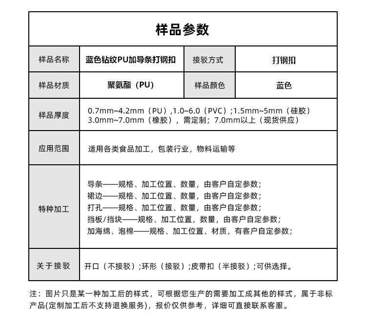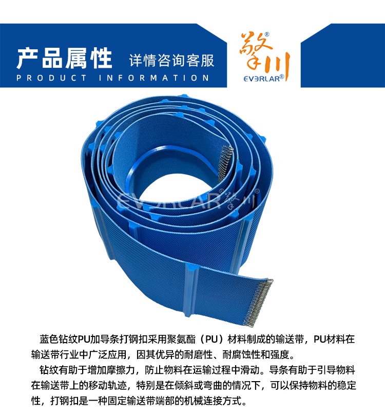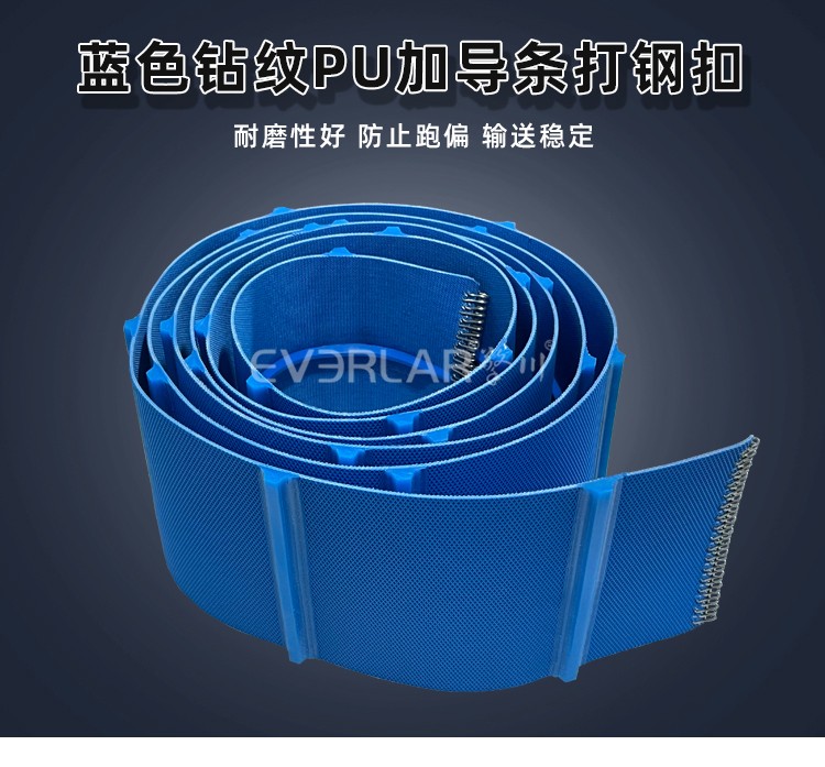 產(chǎn)品名稱:藍(lán)色鉆紋PU輸送帶加導(dǎo)條打鋼扣耐磨易清潔工業(yè)皮帶定制