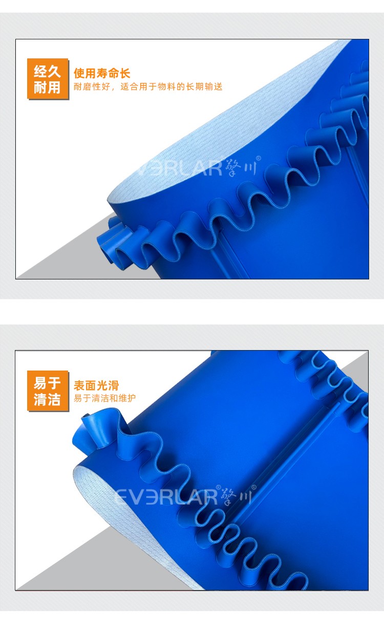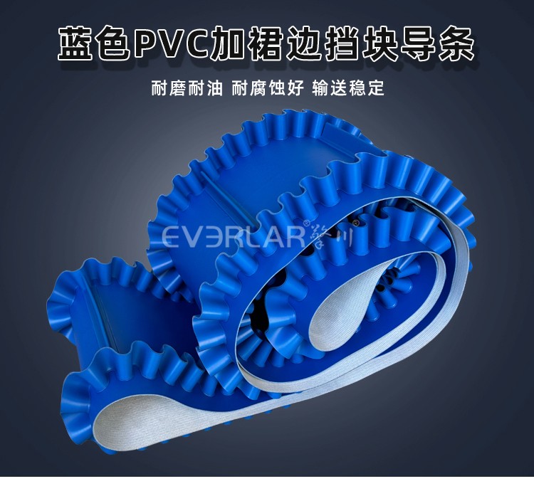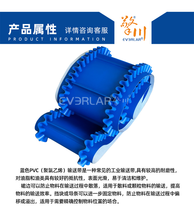 產(chǎn)品名稱:藍(lán)色PVC輸送帶加裙邊擋板導(dǎo)條耐磨耐油耐腐蝕工業(yè)皮帶定制