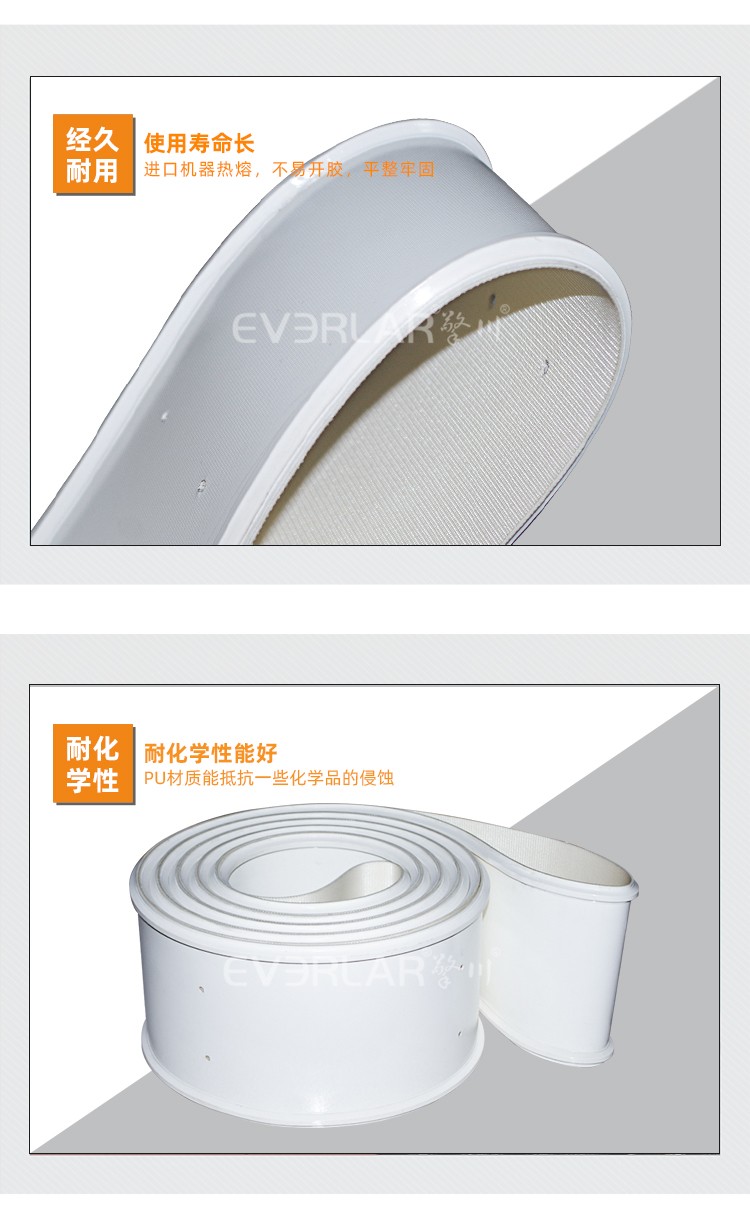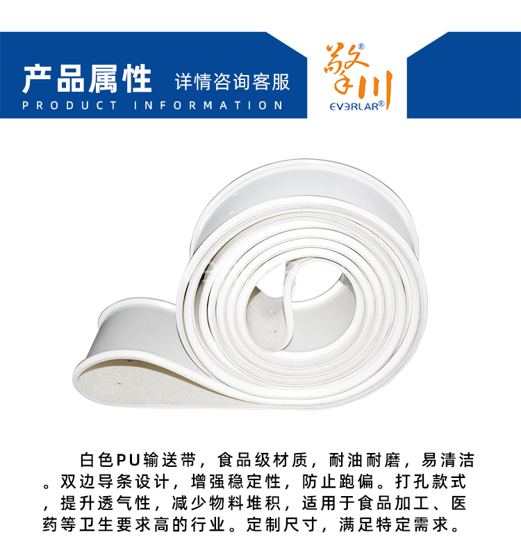 • 產品名稱:白色PU輸送帶加雙邊導條打孔耐磨耐油抗拉力強工業皮帶