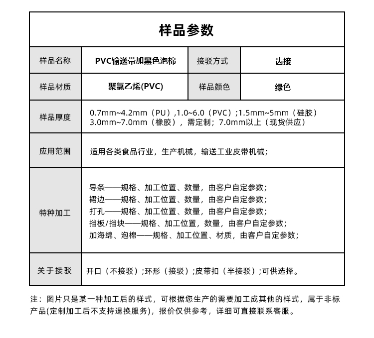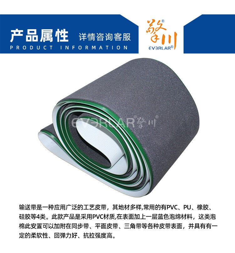 • 產品名稱:綠色PVC輸送帶加黑色泡棉耐磨耐腐蝕耐高溫工業皮帶定制