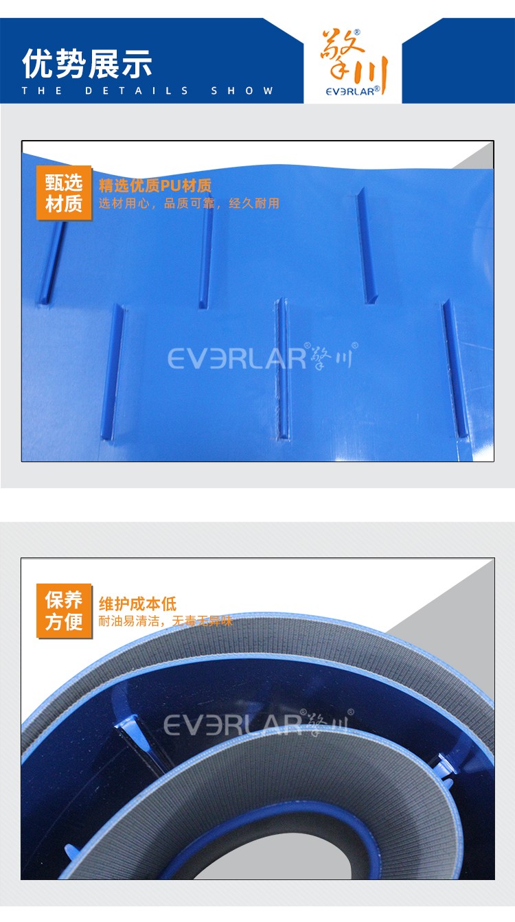 • 產品名稱:藍色PU輸送帶加擋塊耐磨耐油耐腐蝕工業皮帶