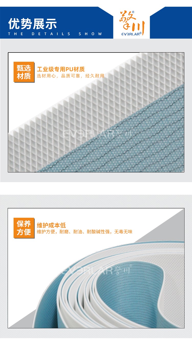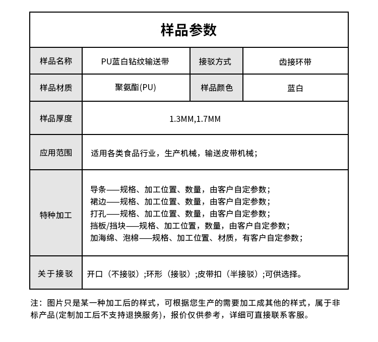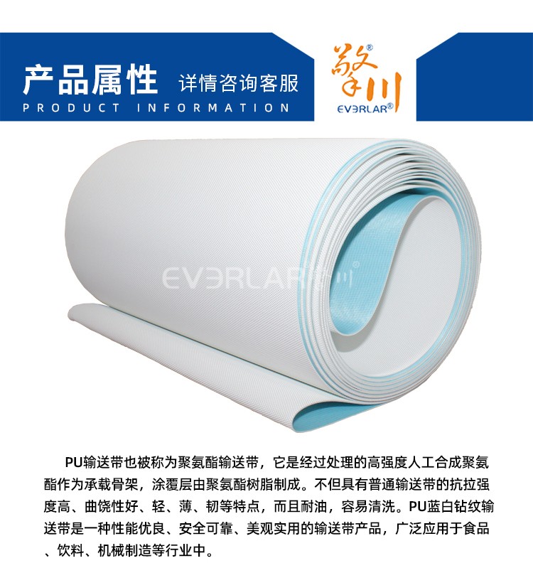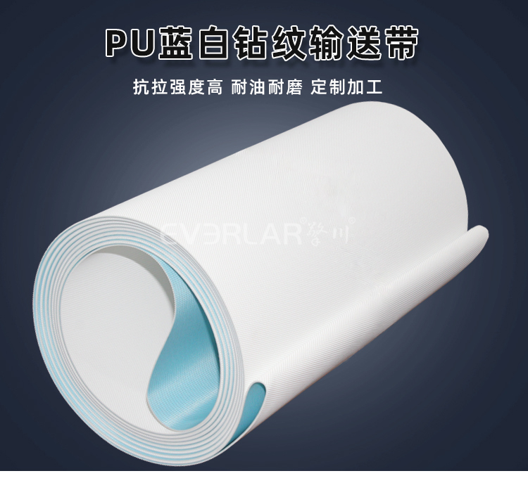 產(chǎn)品名稱:PU藍(lán)白鉆紋輸送帶耐磨耐油耐腐蝕工業(yè)皮帶定制