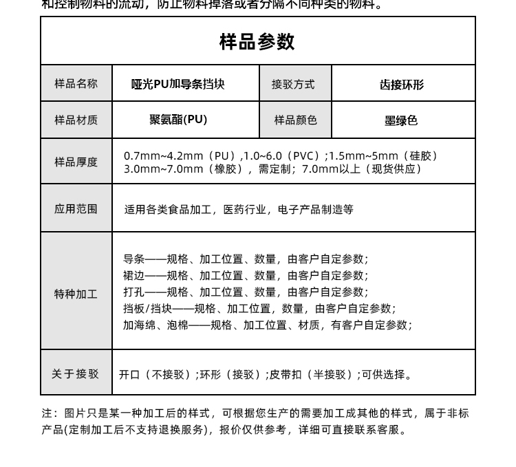• 產品名稱:啞光PU加導條擋塊耐磨降噪耐溫性工業皮帶