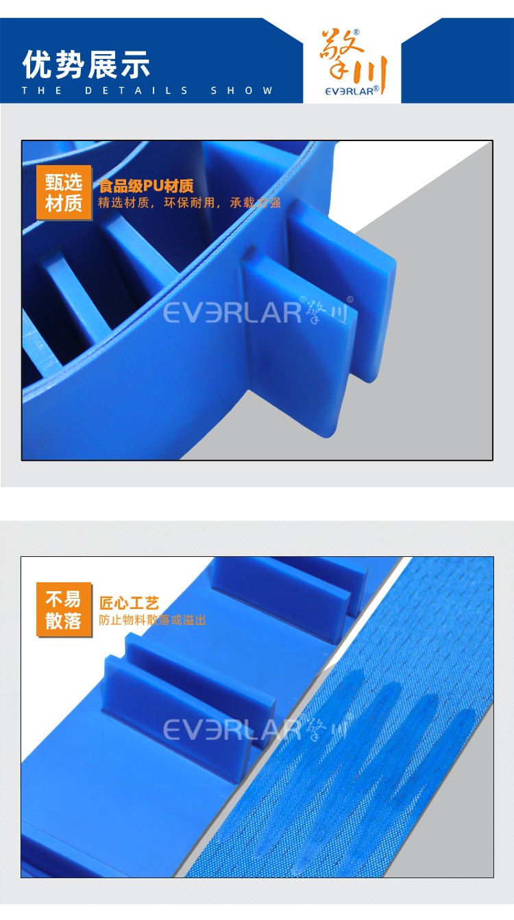 • 藍色PU輸送帶加擋板耐腐蝕食品級海鮮分揀機專配傳輸帶廠家定制