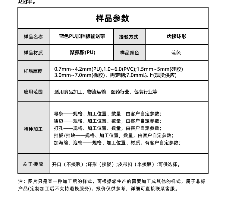 • 產品名稱:藍色PU輸送帶加擋板耐腐蝕食品級海鮮分揀機專配傳輸帶廠家定制