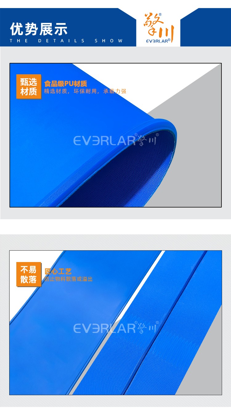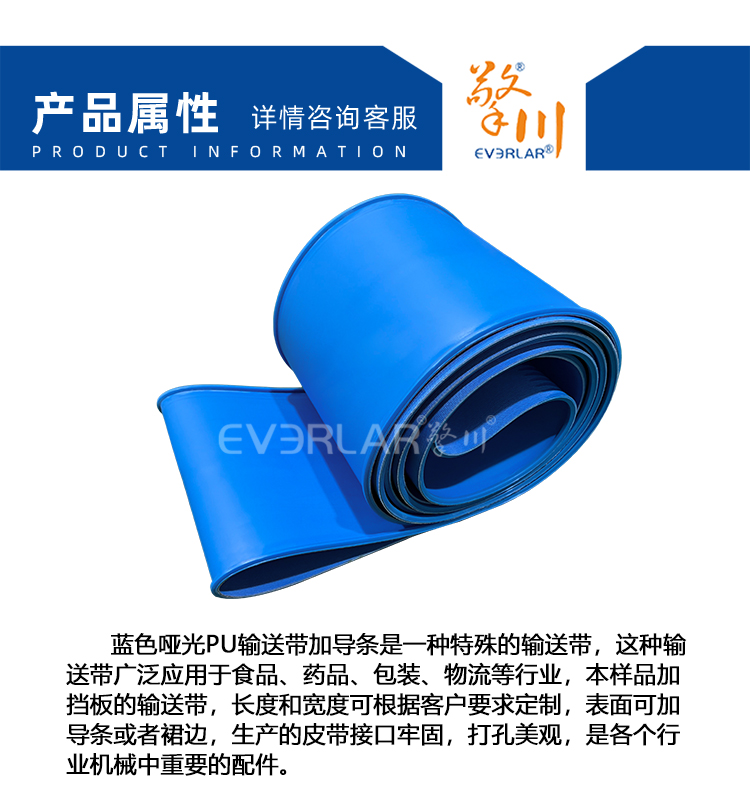 • 產品名稱:PU輸送帶加導條耐磨耐油食品級藍色啞光傳送帶食品包裝生產線皮帶