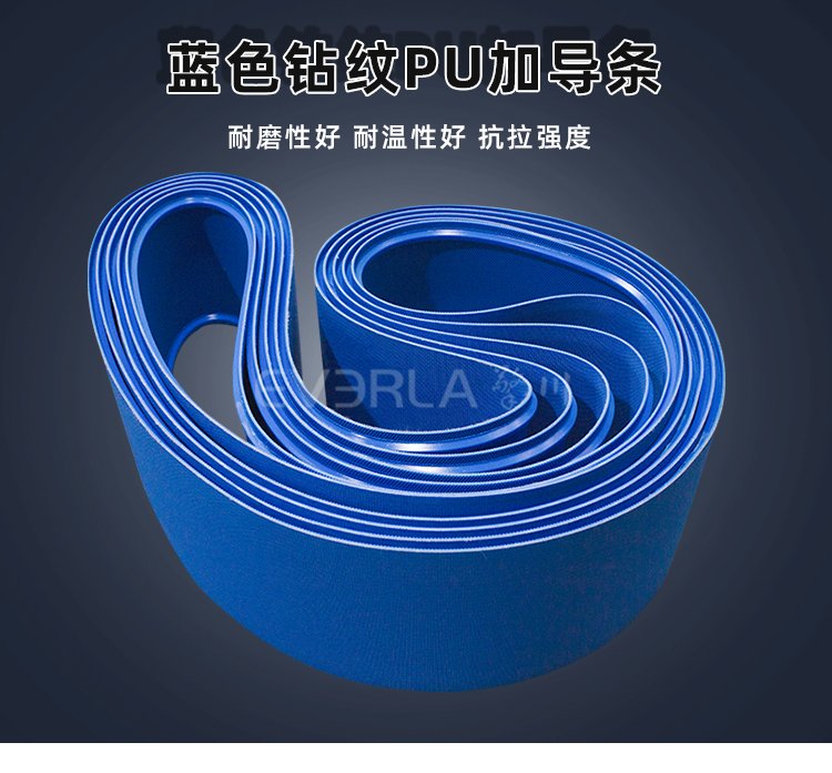 藍色鉆紋PU加導條的輸送帶主體材質為聚氨酯(PU)。聚氨酯材料賦予該PU輸送帶耐油、耐磨及耐寒特性。這種材料特性使其適應食品加工環境中的復雜工況,適用于糖果、餅干、肉類等物料的輸送環節。